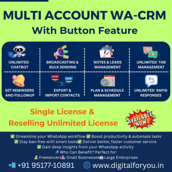 Boost your business with DFY WaCRM β the ultimate WhatsApp CRM tool for message scheduling, chatbot automation, multi-account management, and smart marketing. Perfect for freelancers, small businesses, and enterprises.